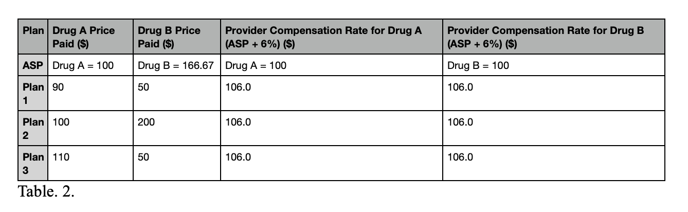 If plan 3 uncovers one price for drug B, and drug B’s price is dropped to match plan 1, this price concession alters the calculation. Drug B’s ASP drops and is now $100[21] and providers are now compensated only $6 compared to the $10 before the price concession.