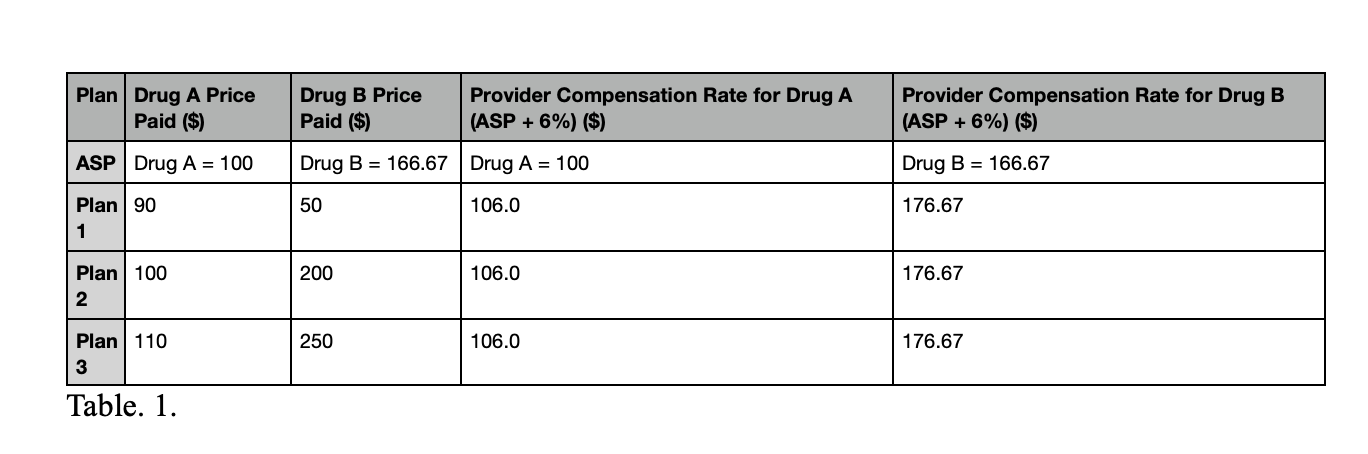 A hypothetical example further reinforces this idea. Let’s say Drug A’s list price is $100. Drug A sells to Plan 1 for $90, Plan 2 for $100, and Plan 3 for $110. Drug B’s list price is $200. Drug A sells to Plan 1 for $50, Plan 2 for $200, and Plan 3 for $250. This example shows that the ASP for Drug A is $100[19] where the ASP for Drug B is $166.67.[20] Providers would profit $6 for Drug A and $10 for Drug B. Providers are incentivized to use Drug B despite the more significant cost to CMS.